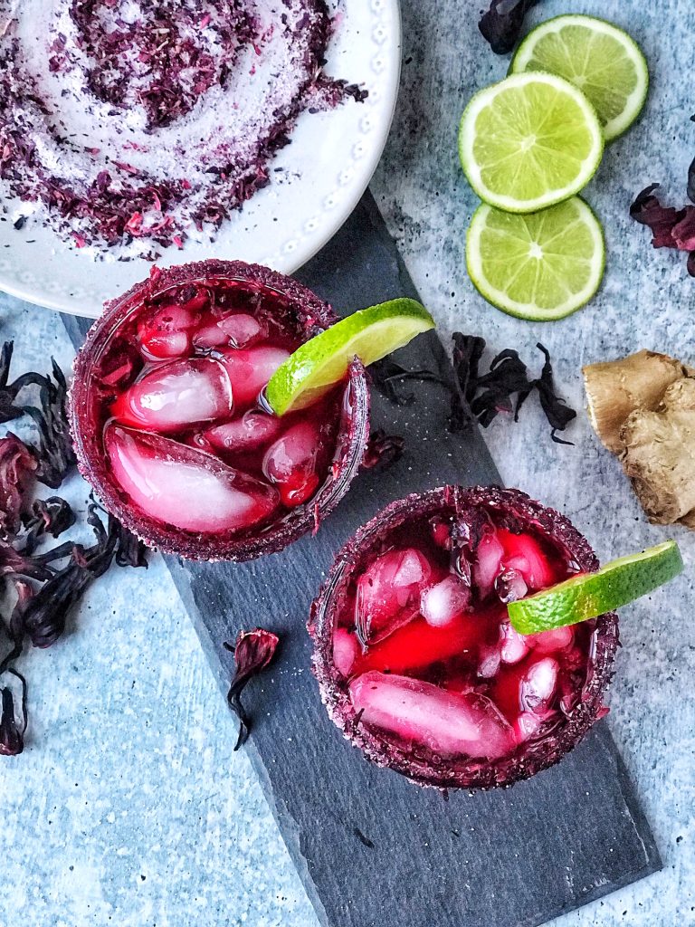 Instructions: For syrup- Bring water to a boil in a small pot or saucepan. Add the hibiscus flowers and sugar, lower the heat to medium, and simmer steadily until the sugar dissolves and the syrup has thickened slightly, about 5 minutes. Strain the mixture through a sieve, and let cool. This makes about 1 ½ to 1 ¾ cups of syrup and keeps up to 1 week in the fridge. To make a single margarita– Combine hibiscus syrup, tequila, Cointreau, and lime juice with ice in a cocktail shaker. Shake well, then strain into a salt-rimmed ice-filled glass, garnish, and serve.